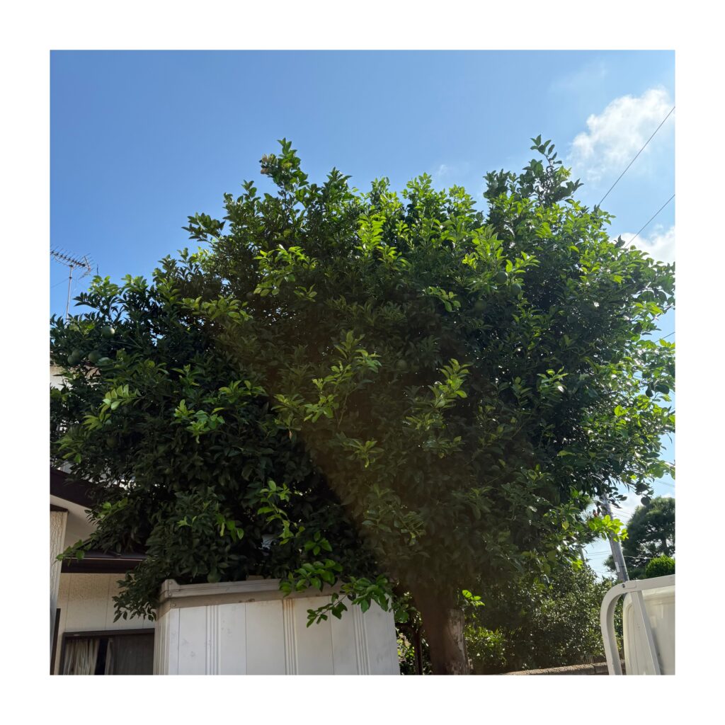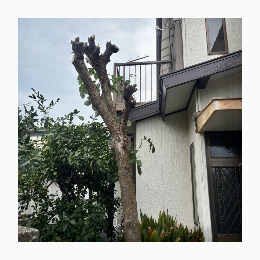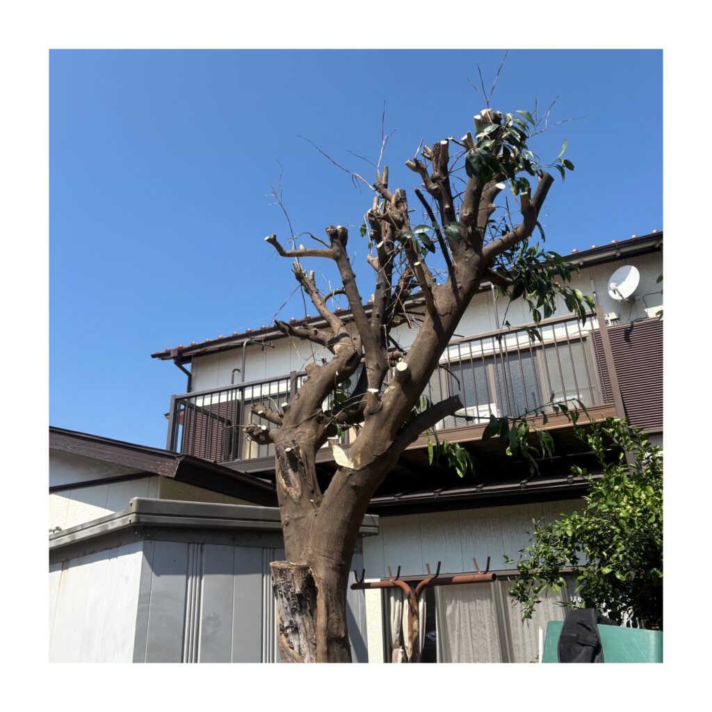 夏みかん、柿、松、幹30センチクラス、強剪定にて枝葉をバッサリ切りました。本当は下から伐採して無くしたかったけど、予算的に厳しいので枝葉無くしに致しました。1人で出来る範囲目一杯切らせて頂きました。