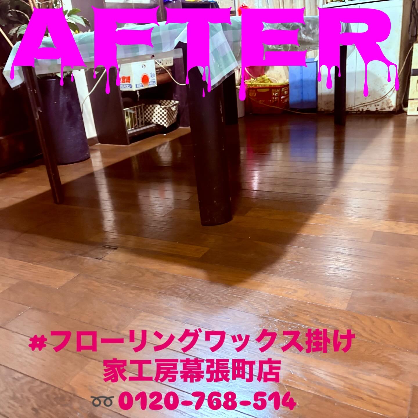 永年の床汚れ。フローリングの為、丁寧に掃除をして仕上げにはきっちりワックス掛けで仕上げました。 お身体の状態によってお掃除が出来ないなどのご相談には家工房幕張町店をご利用ください。